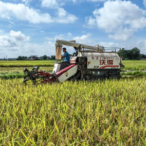 7月2日,在广西钦州市康熙岭镇板坪村,农民驾驶收割机收获稻谷。