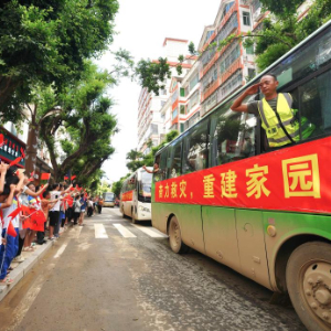 7月3日,在贵州省榕江县,完成任务的抗洪抢险救援队伍撤离时,救援队员、退伍军人陈通刚与路边送行的少先队员相互行礼。