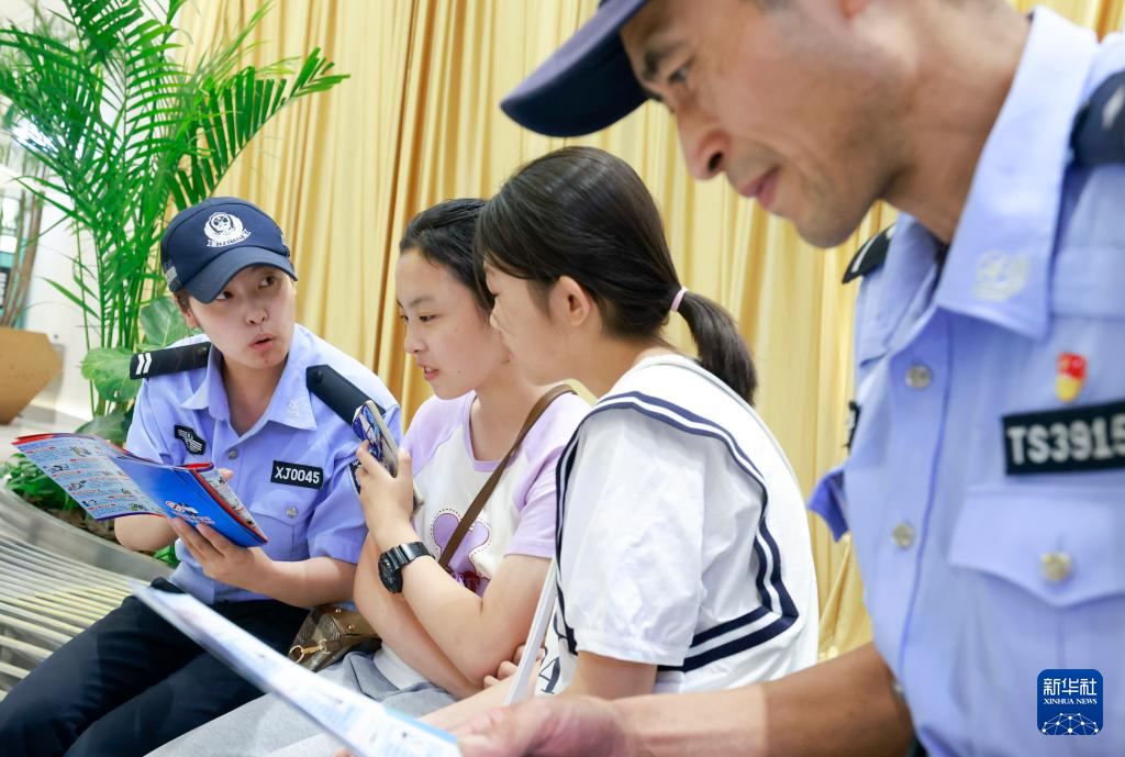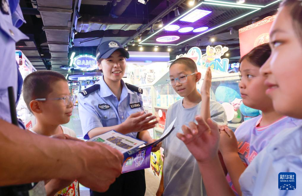 7月2日,在乌鲁木齐时代广场内,乌鲁木齐市公安局天山区分局新民路派出所辅警苏俊霞向小朋友宣传防溺水、反诈等安全知识。