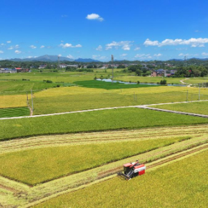 7月3日,在湖南省衡阳市衡山县白果镇,村民驾驶收割机收割早稻(无人机照片)。