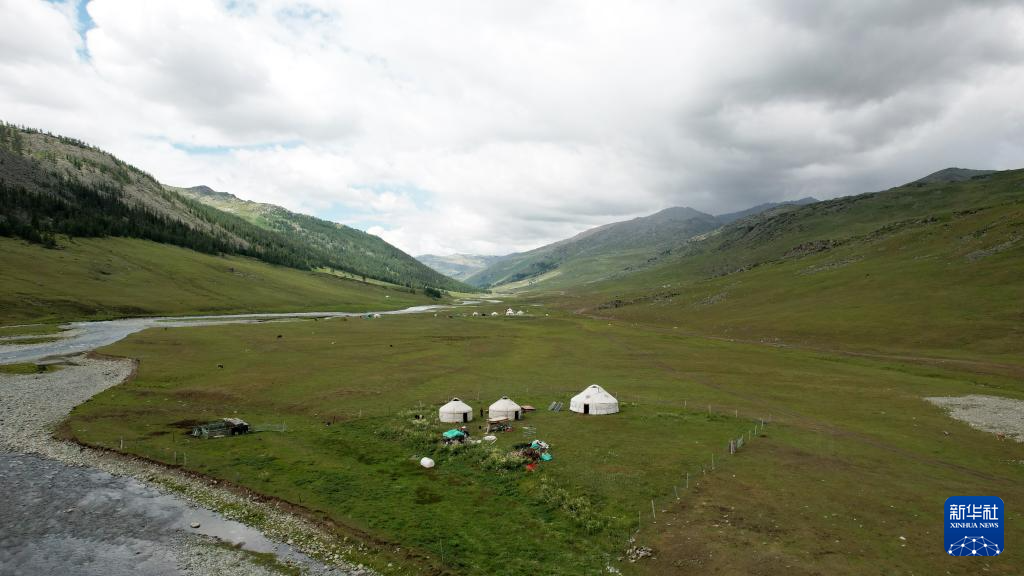 7月2日,在新疆阿勒泰市野卡峡,刚刚转场而来的牧民们已搭建好毡房(无人机照片)。