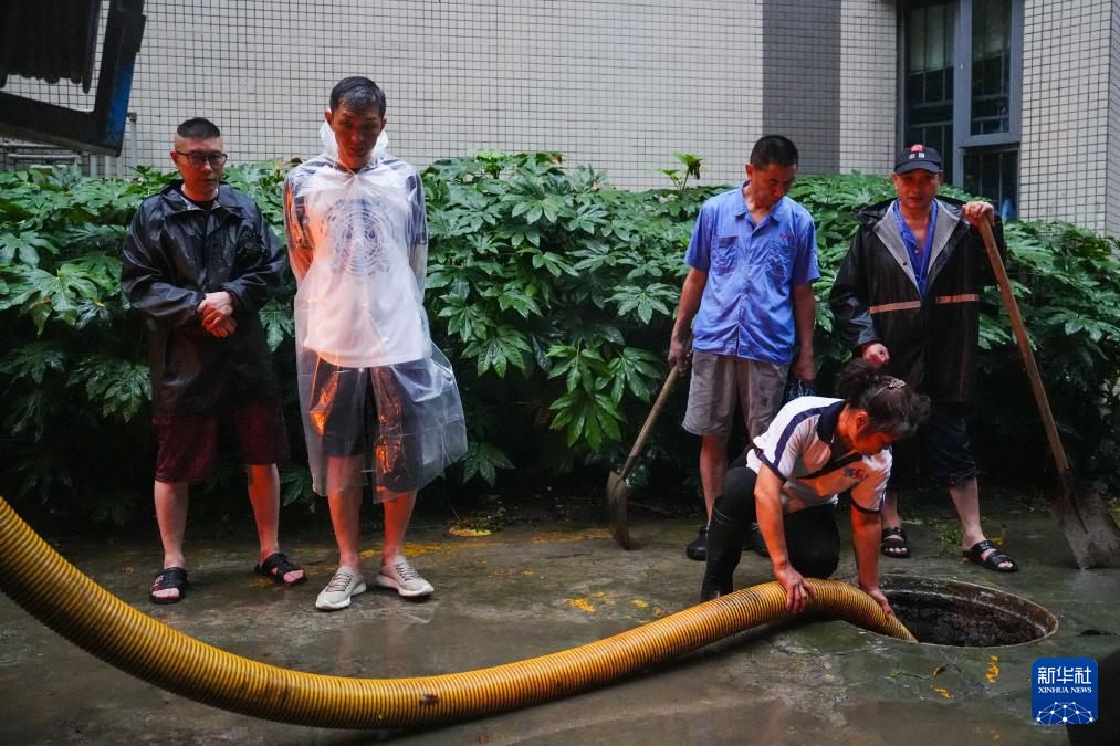7月3日,成都市成华区跳蹬河街道锦绣社区工作人员利用排污车清理积水。