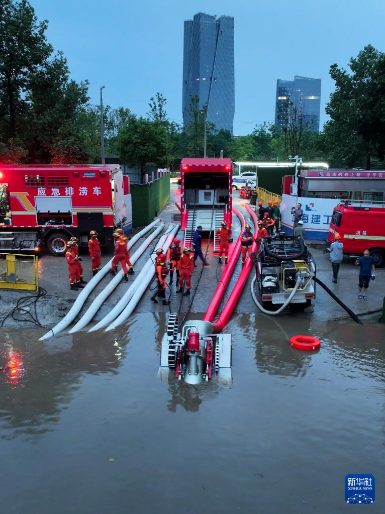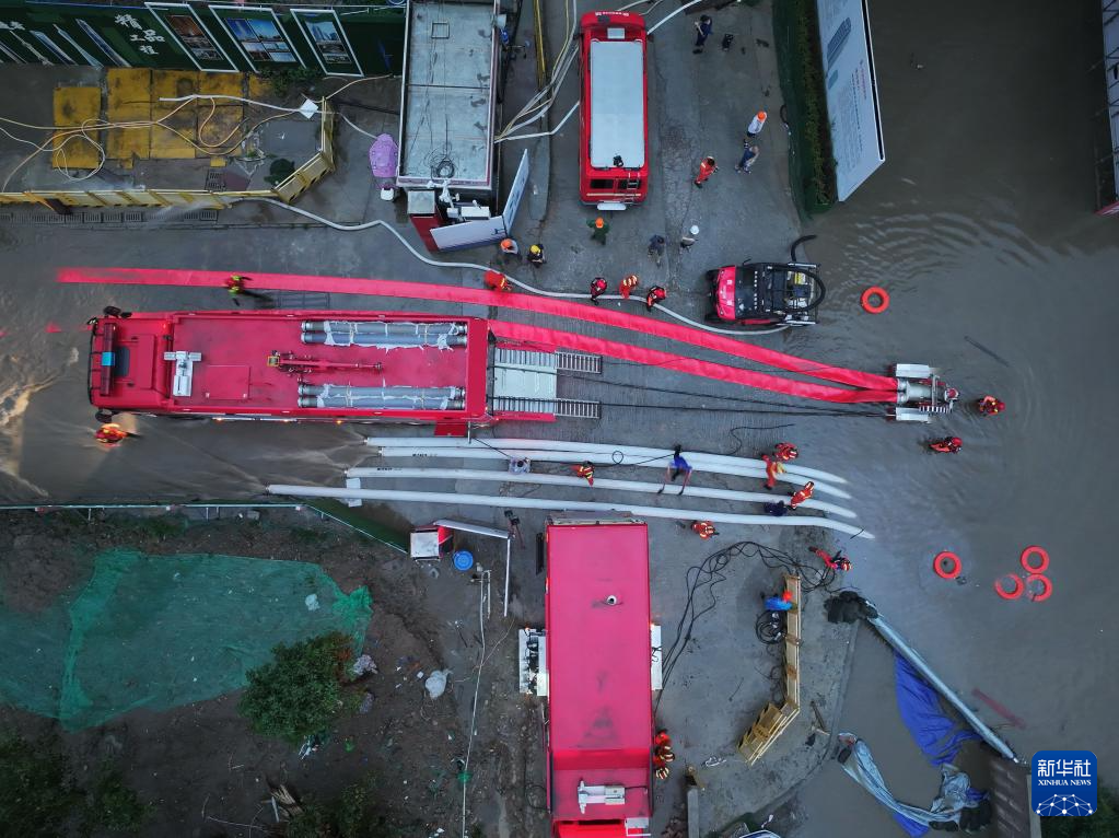 7月3日,四川省森林消防总队特勤大队一中队消防员在成都市锦江区采用应急排涝车、大功率水泵协同排水(无人机照片)。