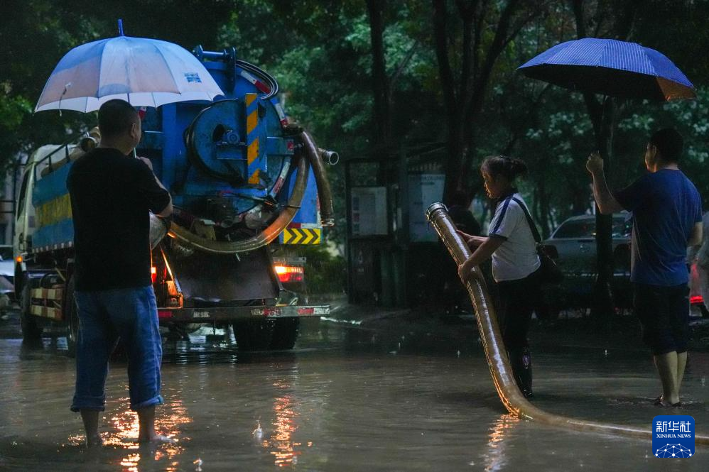 7月3日,成都市成华区跳蹬河街道锦绣社区工作人员利用排污车清理道路积水。