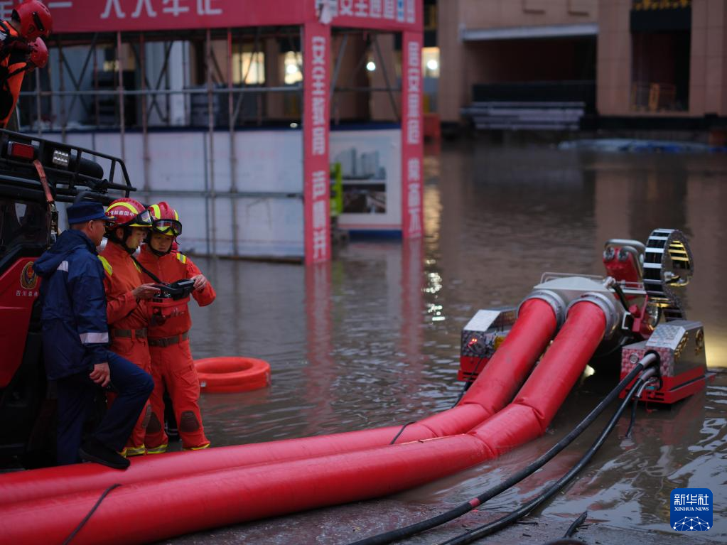 7月3日,四川省森林消防总队特勤大队消防员在成都市锦江区进行排涝作业。