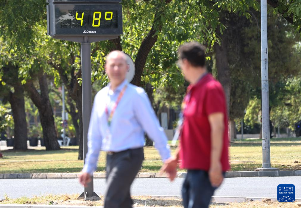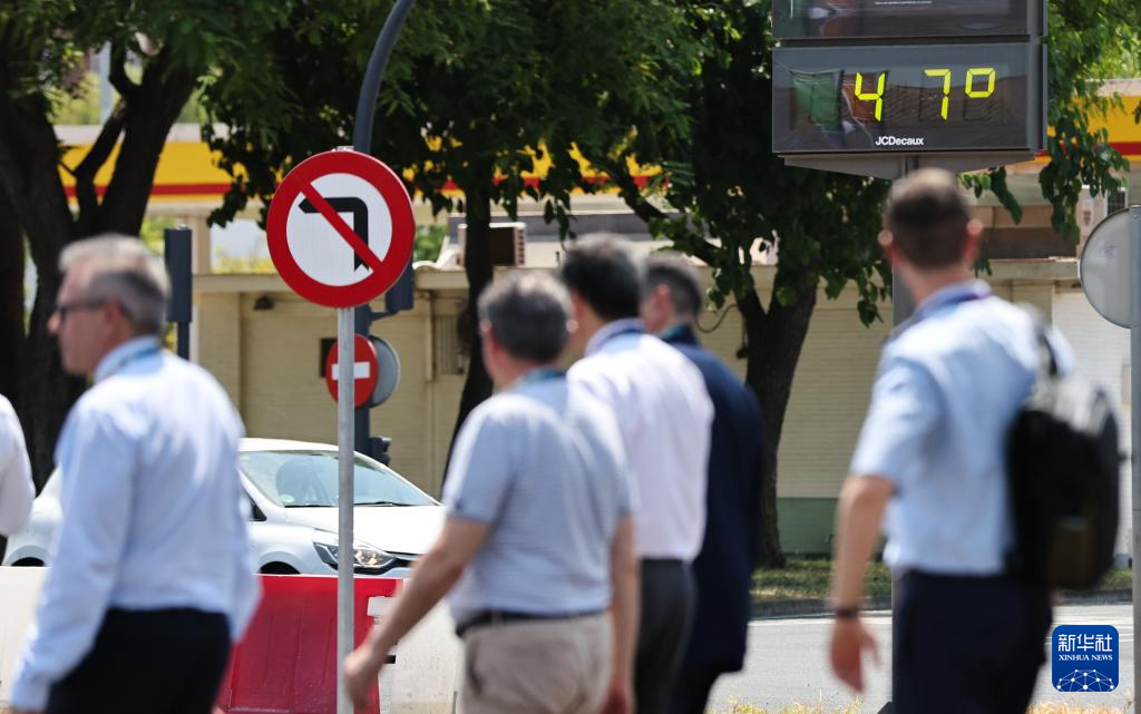 6月29日,在西班牙塞维利亚,室外温度计显示47摄氏度高温。