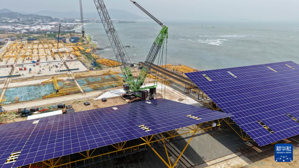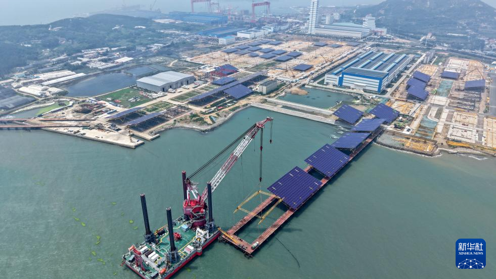 在青岛即墨海上光伏项目光伏平台组装场区,一榀正在组装中的光伏平台由1380 块光伏板和支架组成(7月3日摄,无人机照片)。