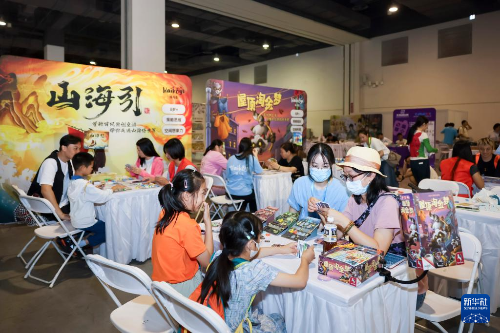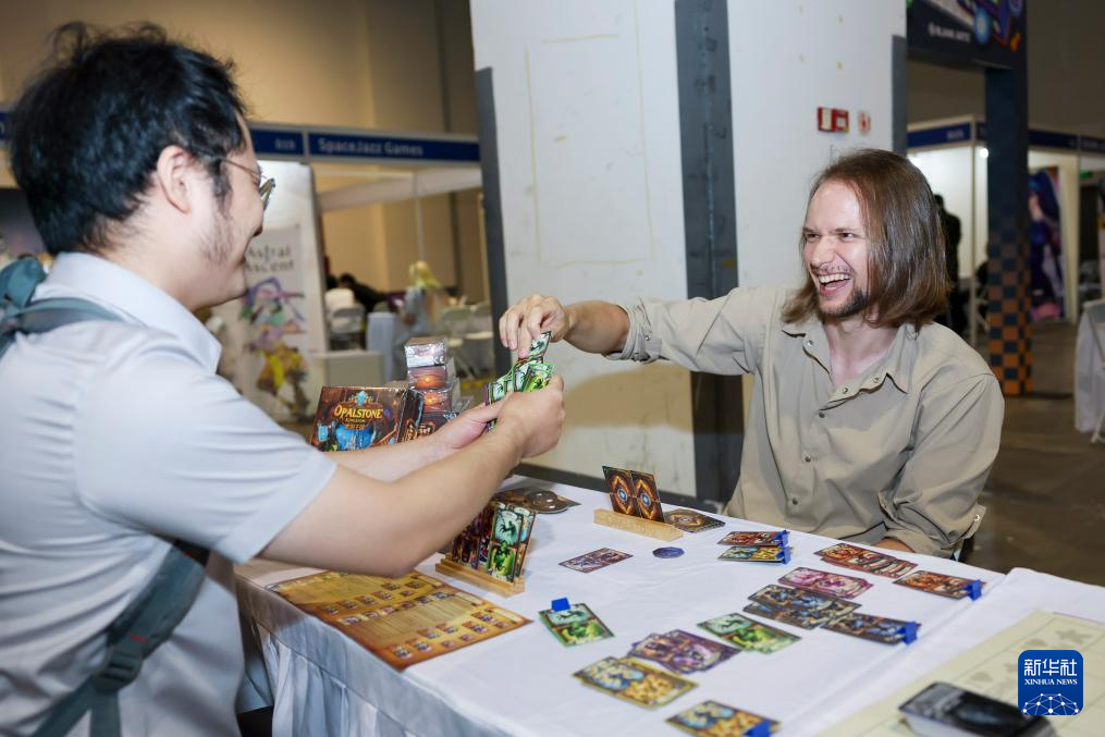 7月4日,来自俄罗斯的参展商现场展示自己设计的卡牌游戏。