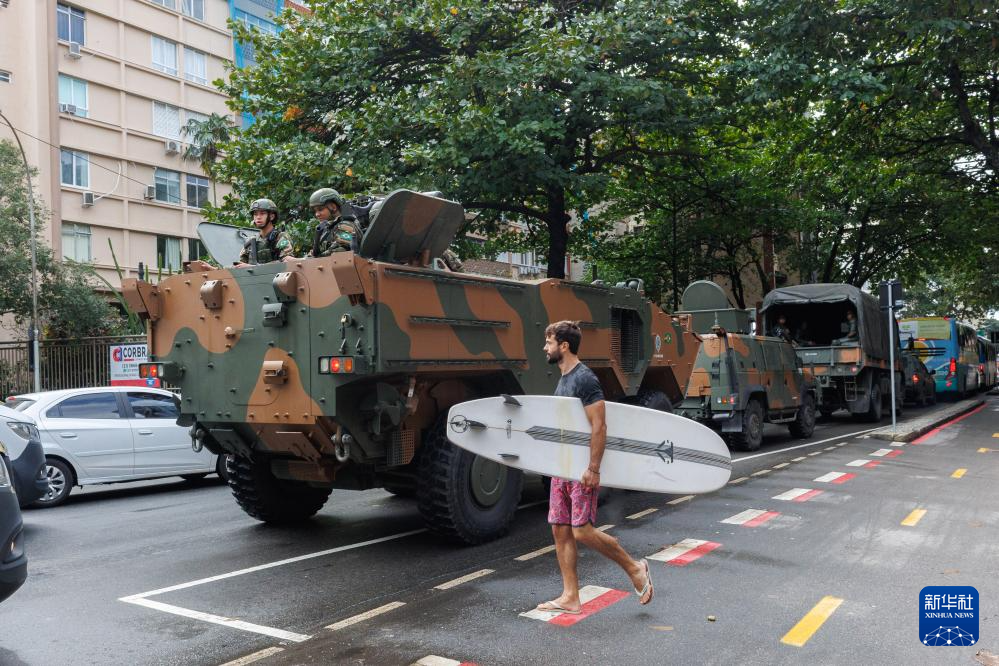 7月3日,在巴西里约热内卢,一名男子走过一辆安防车辆。