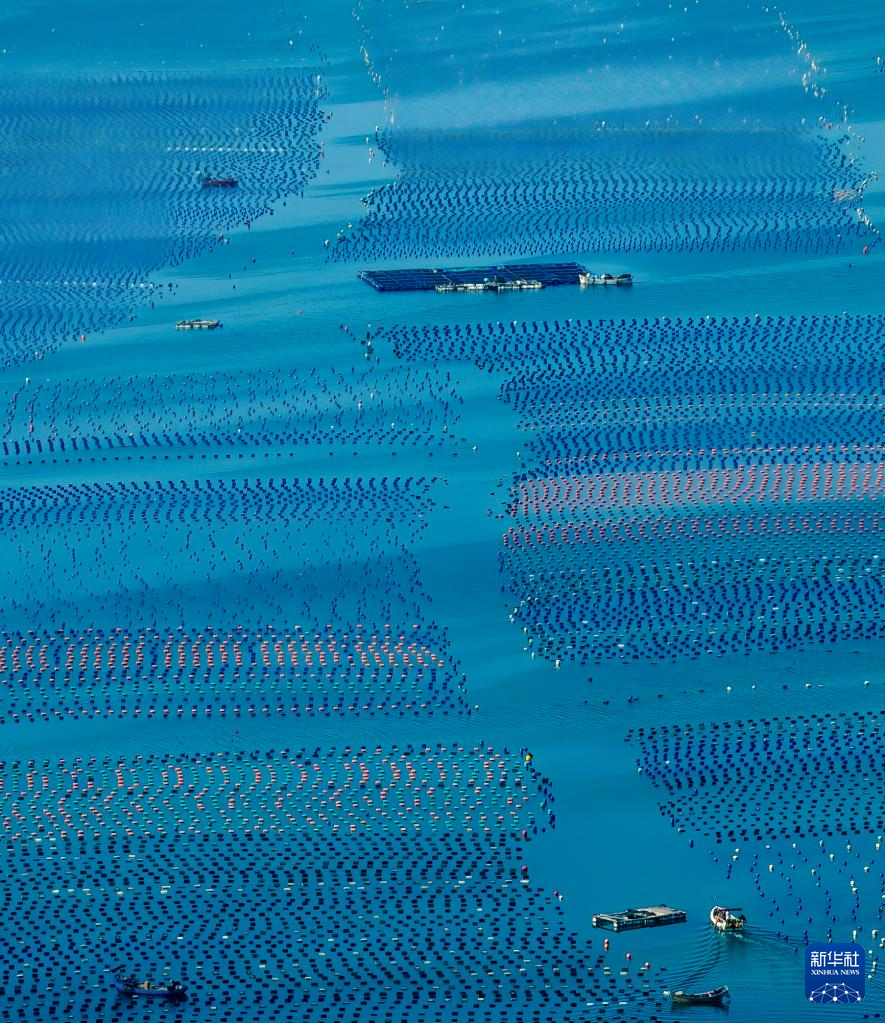 在连江县海域,养殖渔排与排列整齐的浮球交织出一幅多彩的“海上牧场”画卷(7月3日摄)。