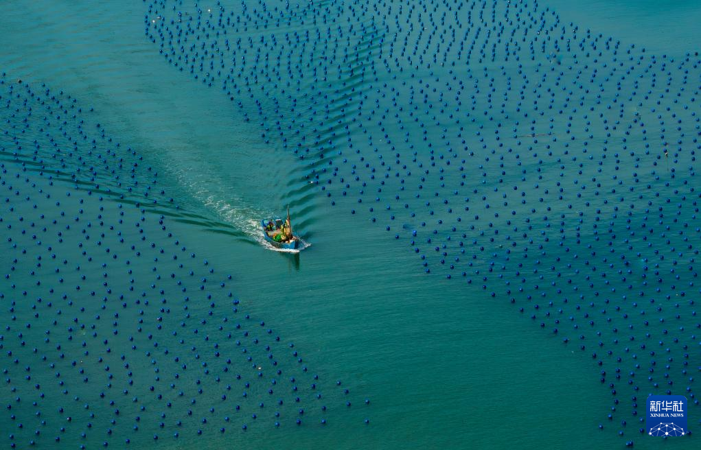 在蔚蓝的海面上,养殖渔排与浮球交织出一幅多彩的画卷(7月3日摄,无人机照片)。