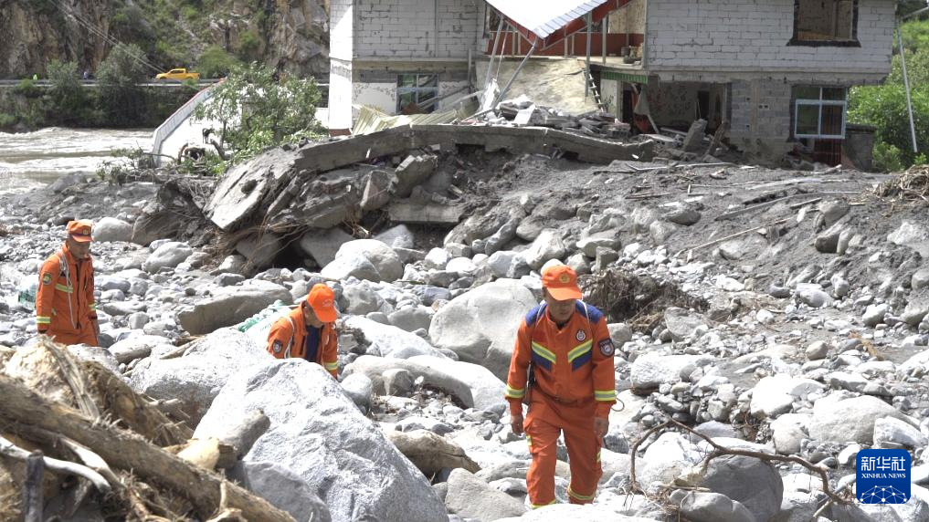 7月5日,在四川省甘孜藏族自治州丹巴县巴底镇沈足沟山洪泥石流现场,救援人员开展搜寻工作。