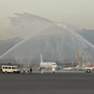 7月4日,在哈萨克斯坦阿拉木图国际机场,东方航空公司上海至阿拉木图直飞航线客机穿过象征民航最高礼仪的“水门”。