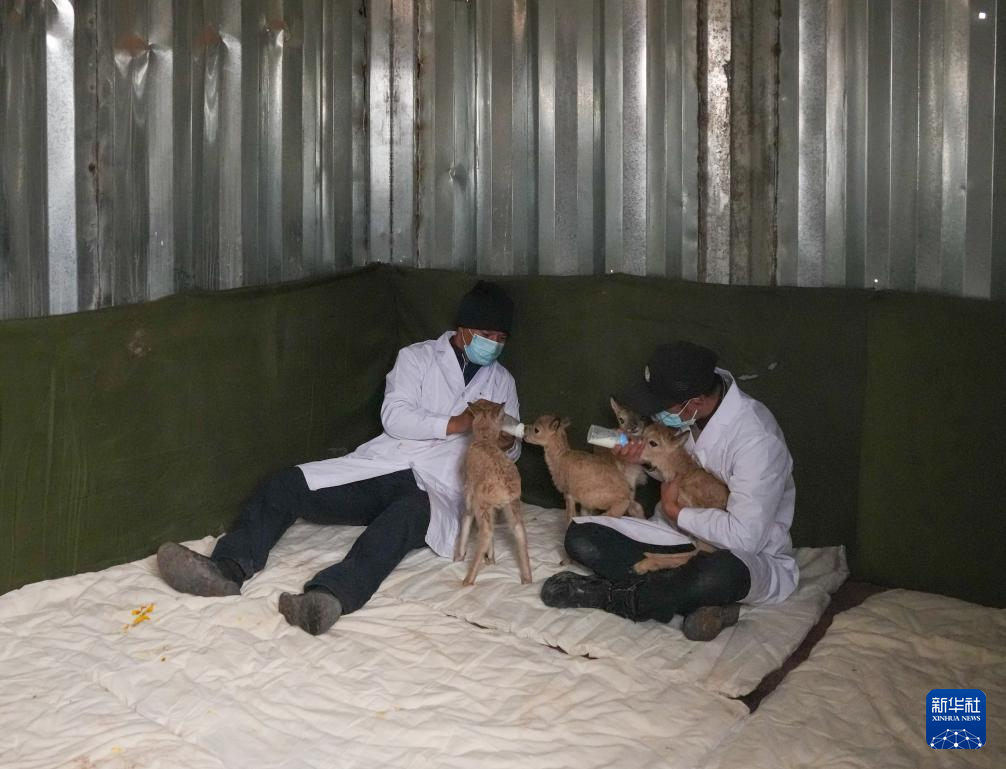巡山队员在可可西里卓乃湖保护站给救助的小藏羚羊喂奶(7月2日摄)。