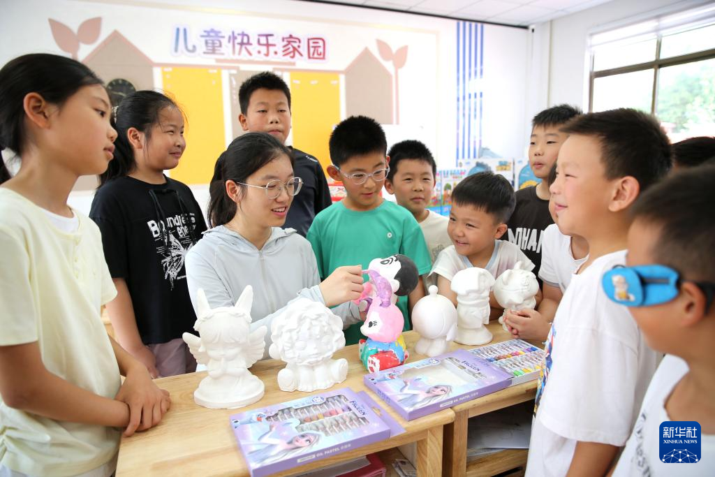 7月7日,大学生志愿者和孩子们一起在江苏省连云港市连云区墟沟街道院前社区公益暑托班上彩绘泥塑。