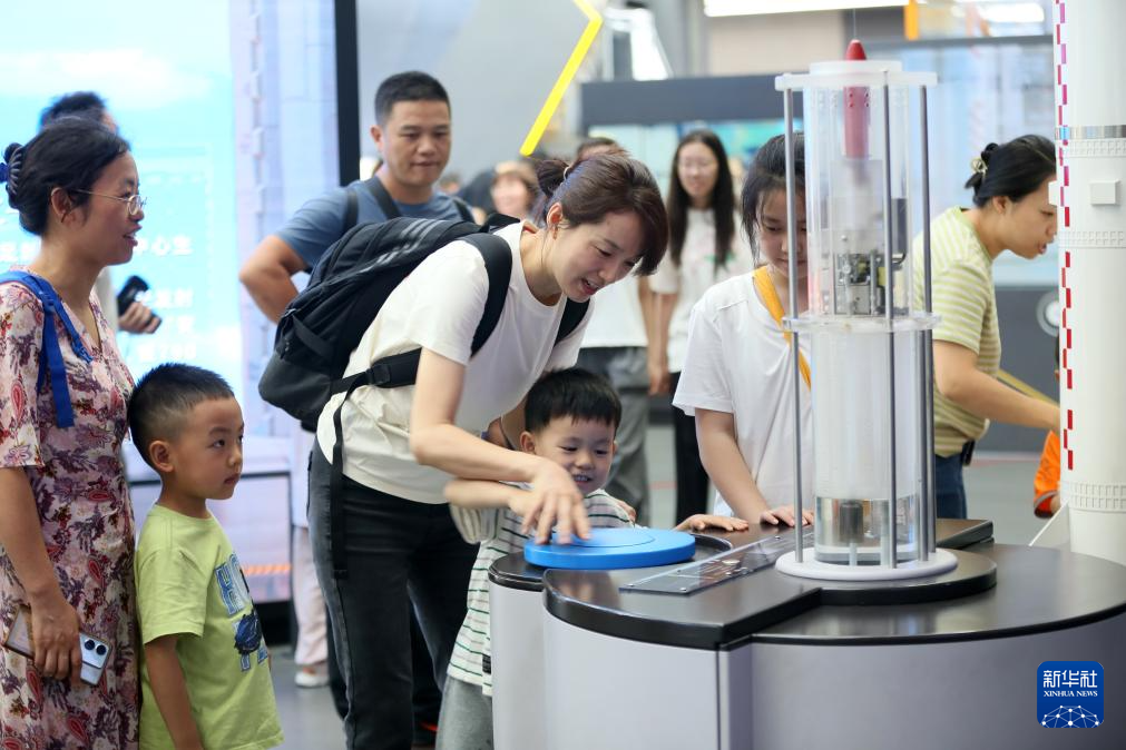7月5日,家长带着孩子在四川科技馆体验科普设备。