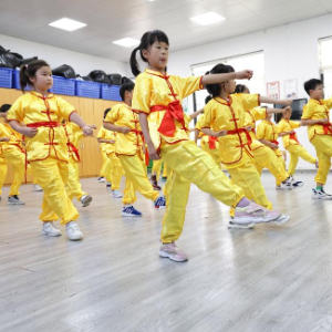 7月7日,小学员们在上海黄浦区老西门街道的爱心暑托班练习少年连环拳。