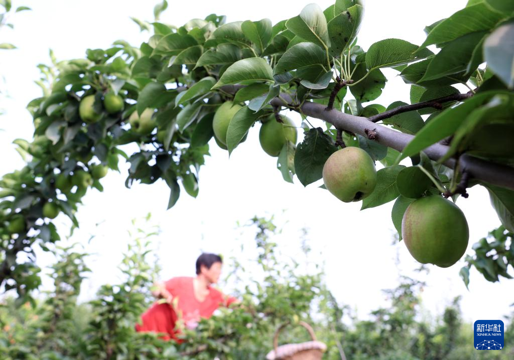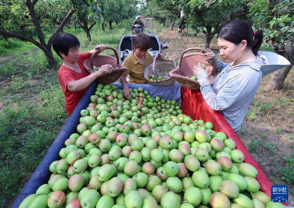 7月8日,河北省赵县范庄镇秀才营村果农在梨园采摘鲜梨。