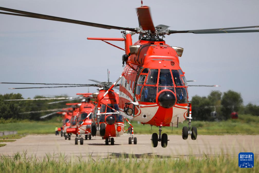 7月8日,在空地协同救援训练现场,救援直升机依次起飞。