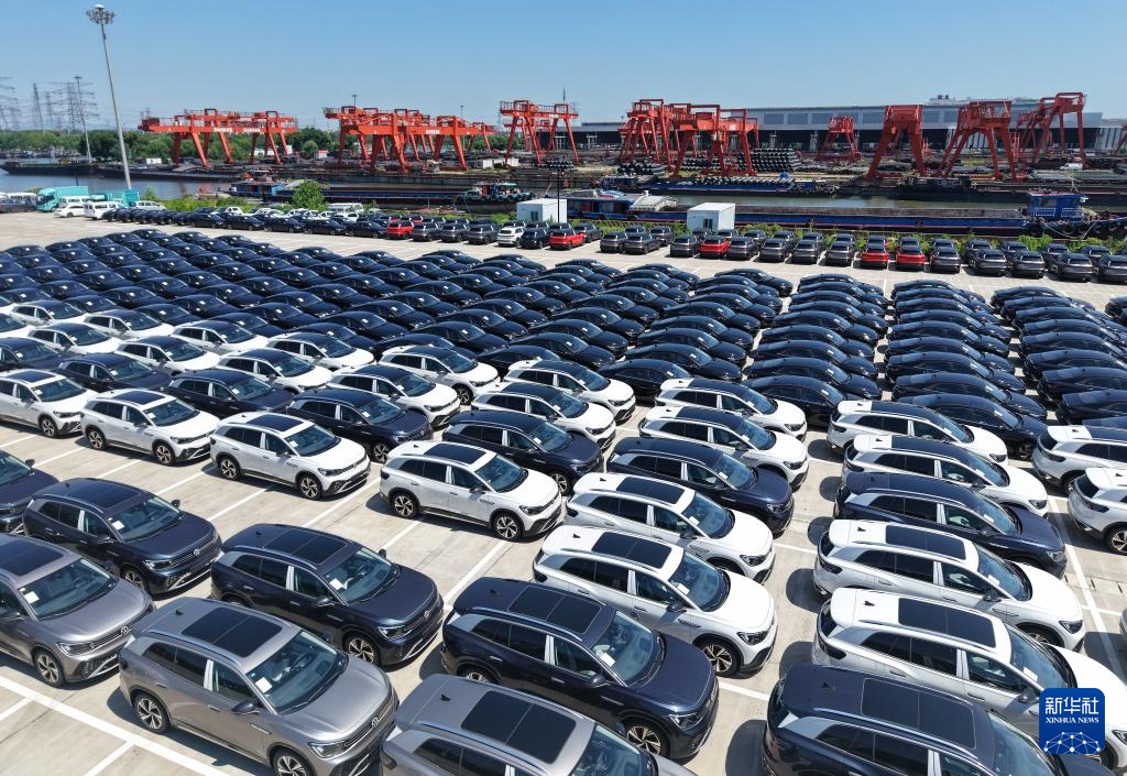 这是京杭大运河杭州段一出口汽车码头上等待出口的新能源汽车(6月29日摄,无人机照片)。