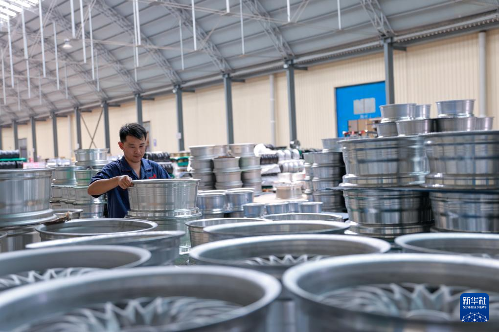 7月10日,工人在山东省聊城市茌平区一家铝制品有限公司车间内搬运汽车零部件。