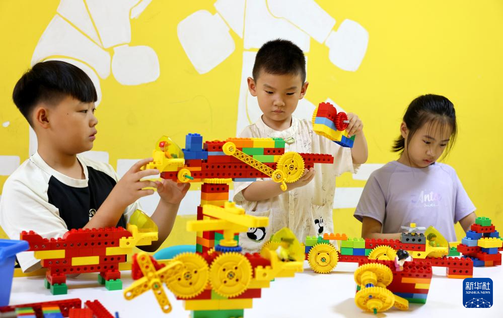 7月12日,在山东省枣庄市一家机器人编程科创中心,孩子们拼装制作机器人。
