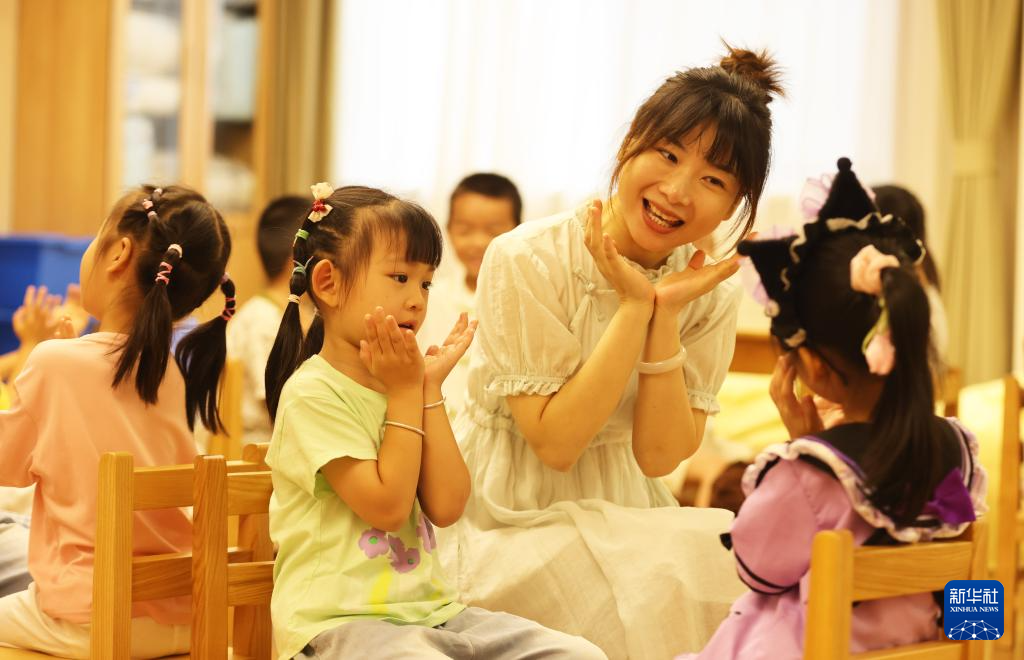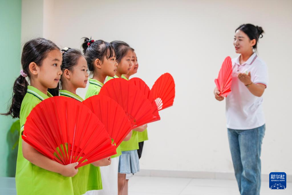 7月12日,在浙江省湖州市德清县乾元镇的青少年宫,孩子在老师引导下玩拍花箩游戏。