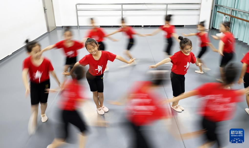 7月12日,在山东省临沂市郯城县郯城街道一家舞蹈培训机构,孩子们在练习舞蹈动作