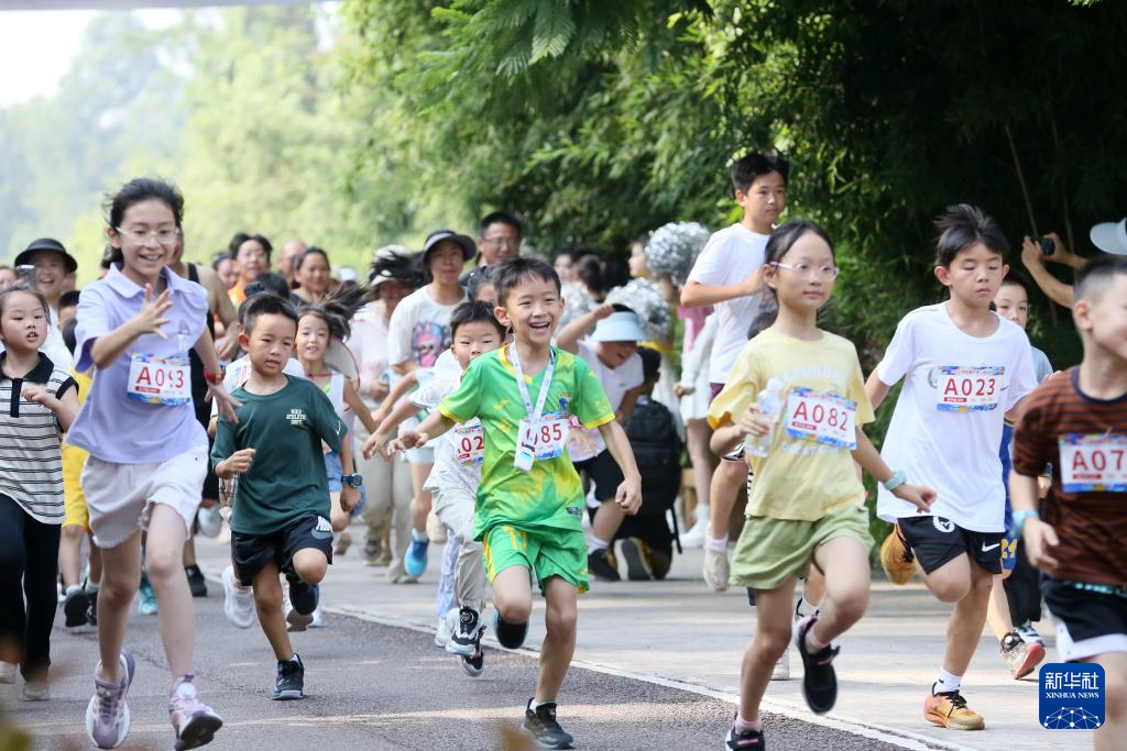 7月12日,在四川省乐山市嘉州绿心公园,孩子们和大人一起在健身步道跑步健身。