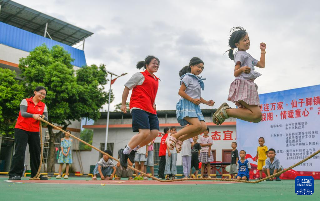 7月11日,在湖南省永州市道县仙子脚镇黄田岗村,志愿者和孩子们一起跳绳。