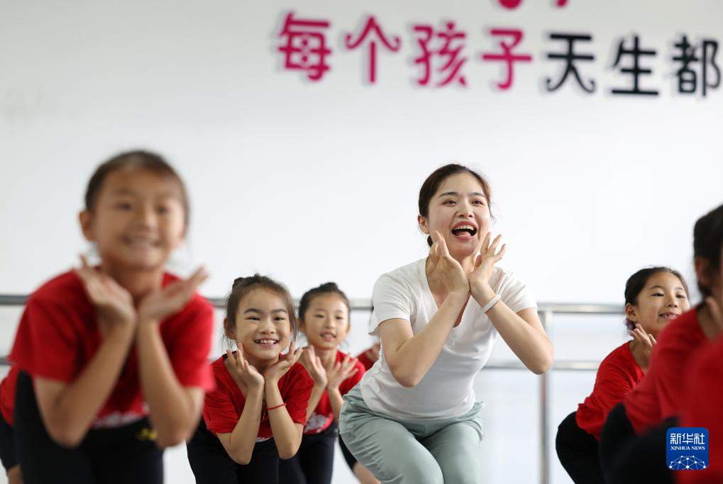 7月12日,在山东省临沂市郯城县郯城街道一家舞蹈培训机构,孩子们在舞蹈老师的带领下练习舞蹈动作。