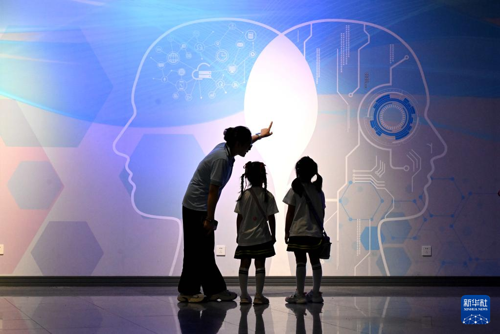 7月12日,在浙江省嘉兴市科技馆,小朋友在体验人工智能ARVR装置。