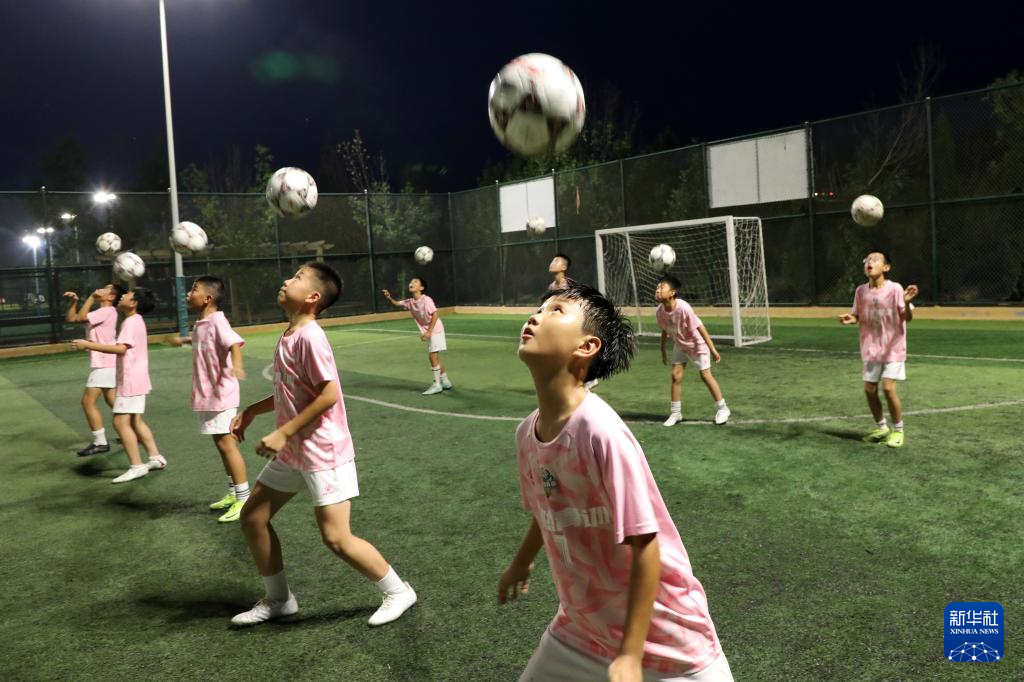 7月10日晚,在山东省滨州市博兴县一家足球俱乐部,小学生在进行足球“夜训”。