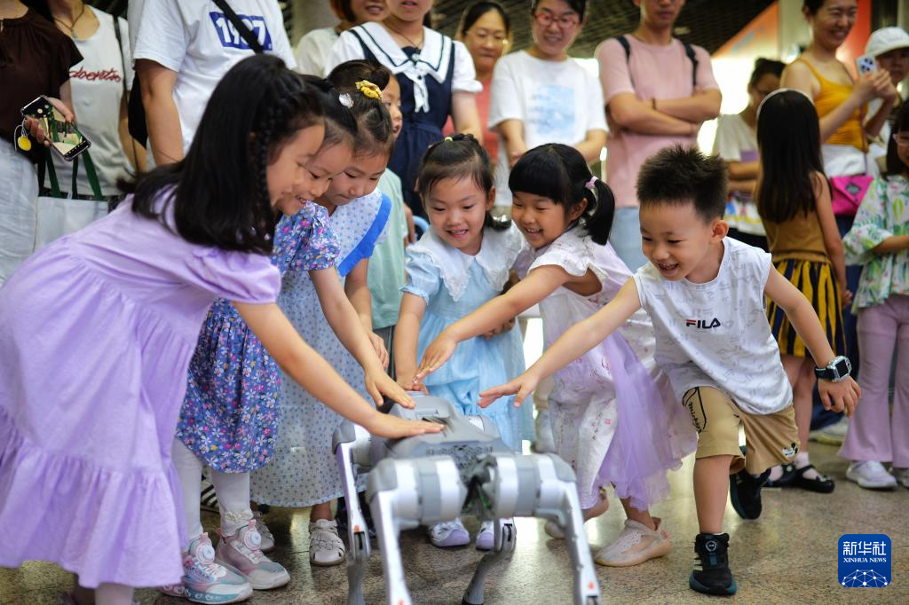 7月12日,山东省青岛市市北区海安幼儿园的小朋友走进科技宫,与仿生机器狗互动。