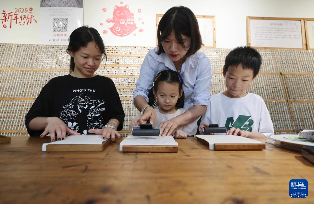 7月12日,在山东省临沂市沂南县铜井镇竹泉村时光印记活字印刷体验馆,参加研学游的孩子们在体验活字印刷术。