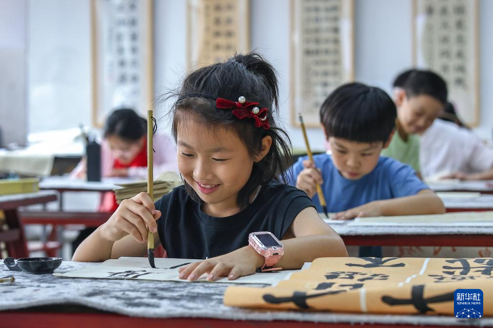 7月12日,在南京市秦淮区少年宫,小朋友学习书法。