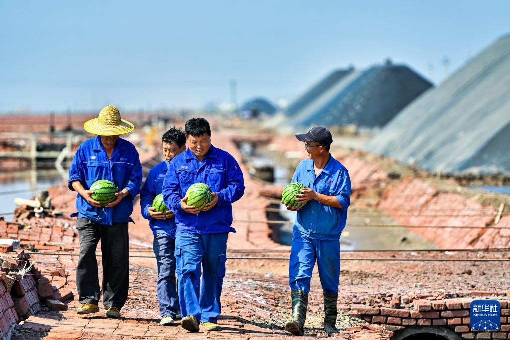 7月13日,在天津长芦海晶集团有限公司的盐田作业现场,工人领取西瓜。