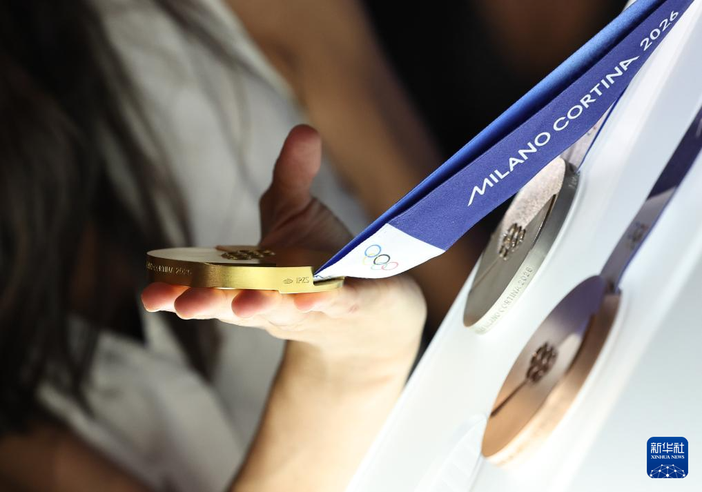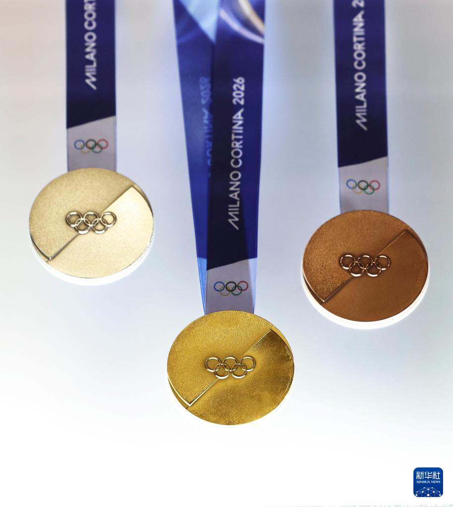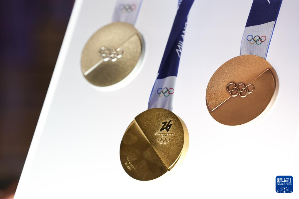 这是发布活动现场拍摄的2026年米兰-科尔蒂纳冬奥会奖牌。