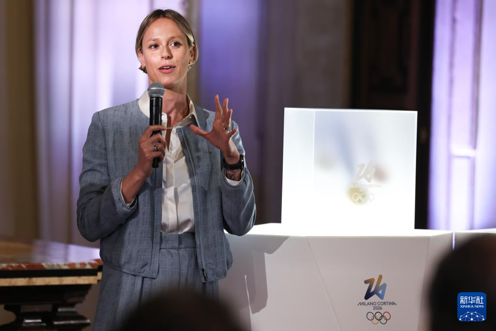 意大利游泳项目奥运冠军费代丽卡·佩莱格里尼在奖牌发布仪式上讲话。