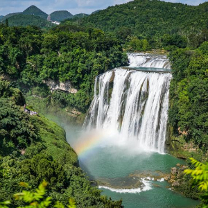 近日,位于贵州省安顺市的黄果树瀑布景区正处于夏日最佳观赏期。黄果树大瀑布水势磅礴,在阳光的照射下,瀑布前架起一道彩虹,美丽的景象吸引各地游客前来观赏游玩。