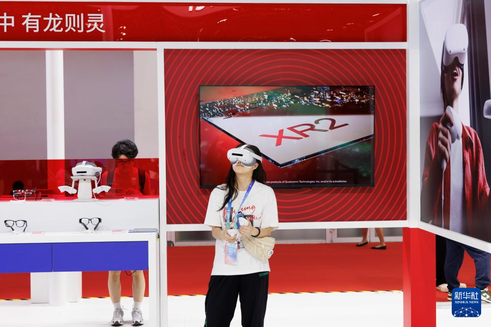 7月16日,一名参观者在数字科技链展区体验虚拟现实游戏。