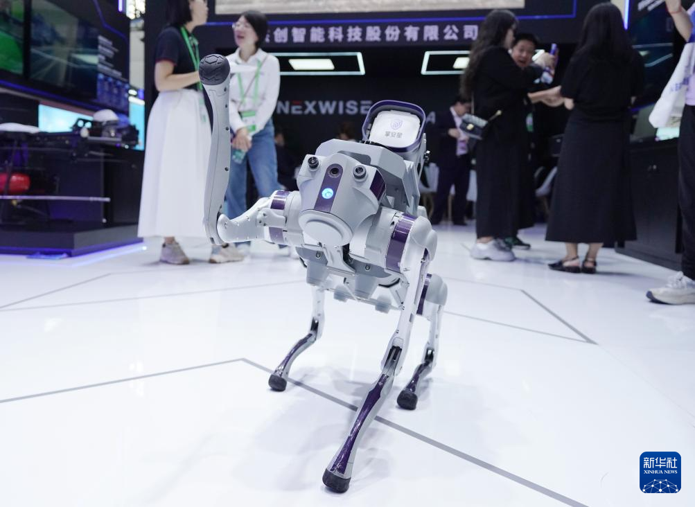 这是7月16日在数字科技链展区拍摄的电磁网捕巡防机器狗。