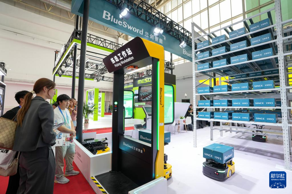 7月16日,参观者在先进制造链展区兰剑智能展台了解“蜘蛛侠悬挂式料箱机器人系统”。