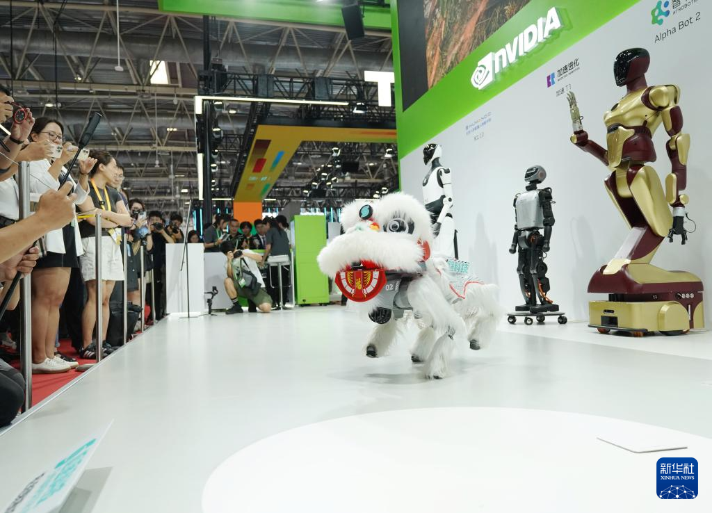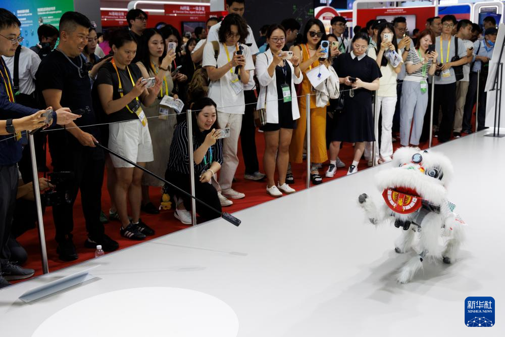 7月16日,观众在数字科技链展区参观一款“机器狮子”表演。