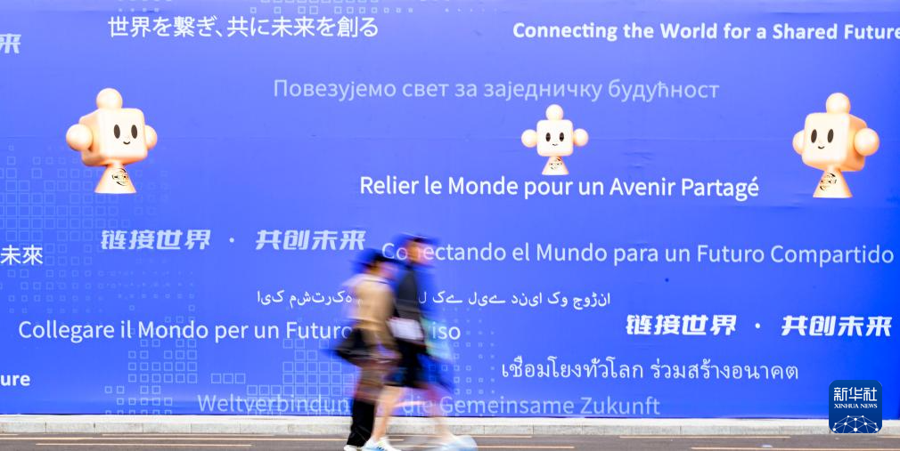 7月16日,人们从第三届中国国际供应链促进博览会的宣传品前经过。