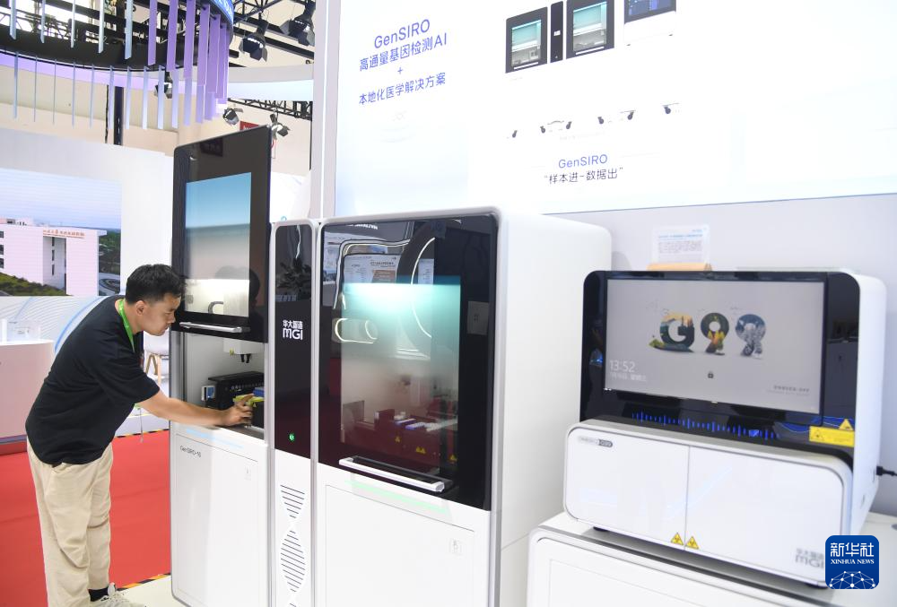 7月16日在健康生活链展区华大集团展位拍摄的高通量基因检测AI+本地化医学解决方案。