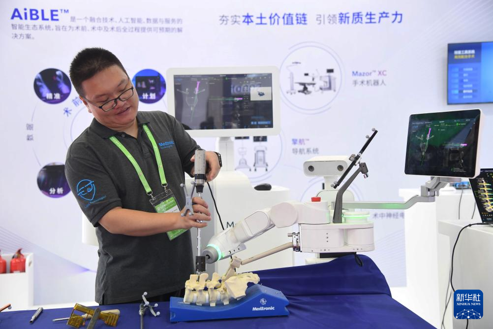 7月16日,工作人员在健康生活链展区展示一款骨科手术机器人。