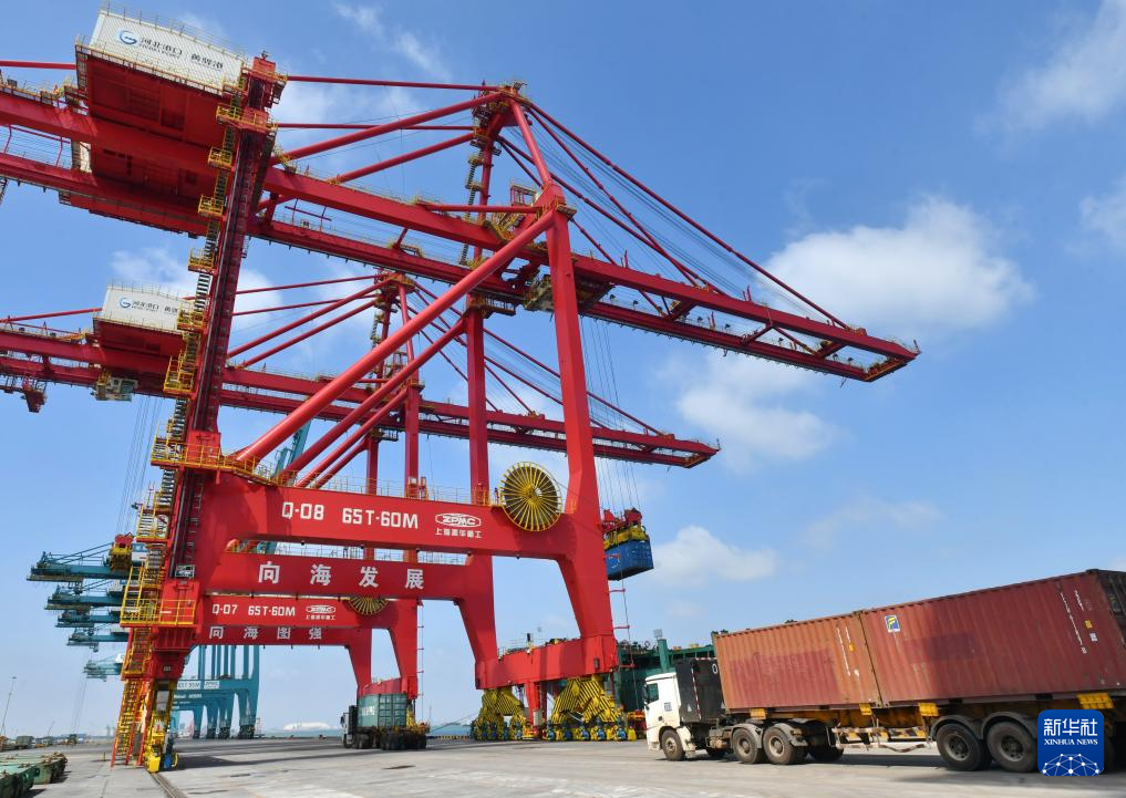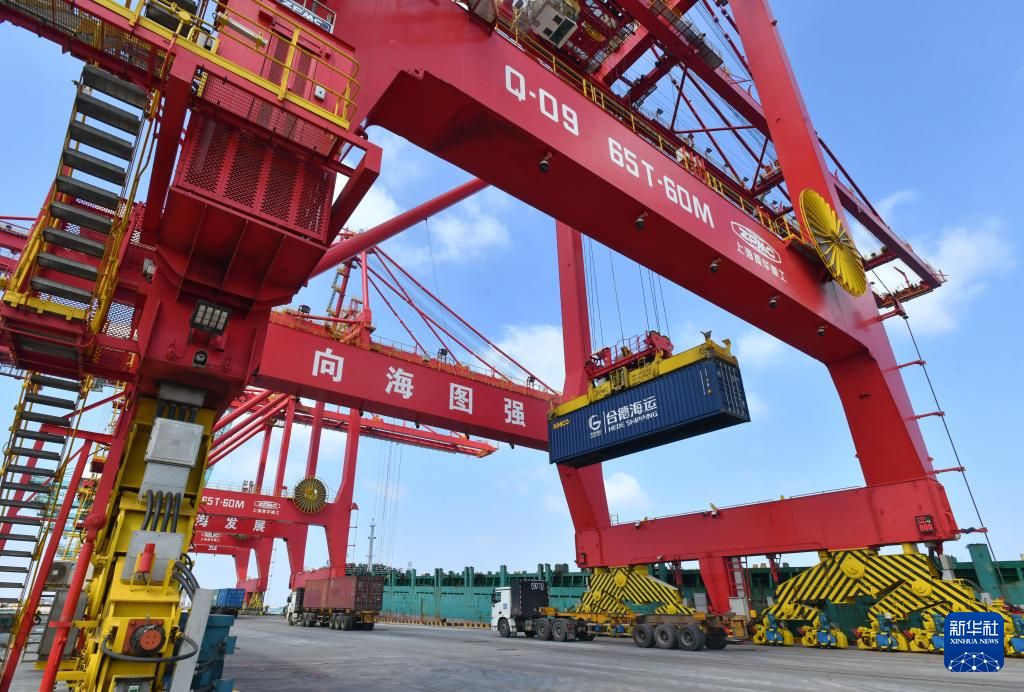 7月16日,工人在黄骅港综合港区集装箱码头操作吊装设备进行装船作业。