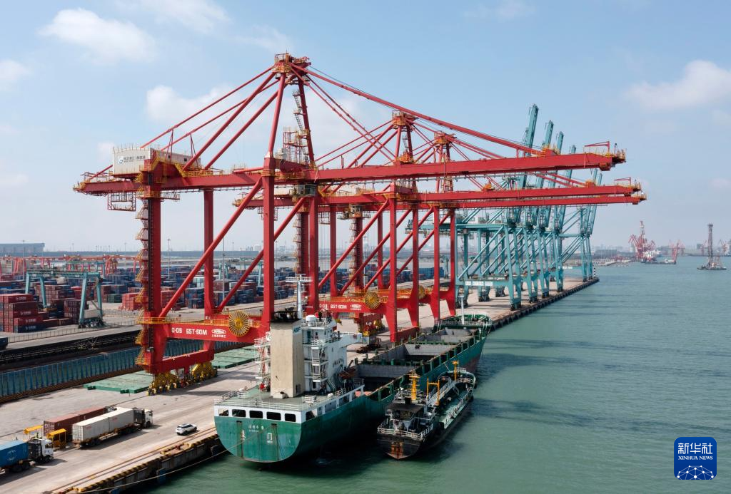 7月16日,一艘轮船靠泊在黄骅港综合港区集装箱码头装货(无人机照片)。