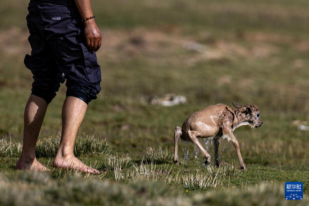 这是一只刚被管护队员救上岸的藏羚羊幼崽(7月14日摄)。